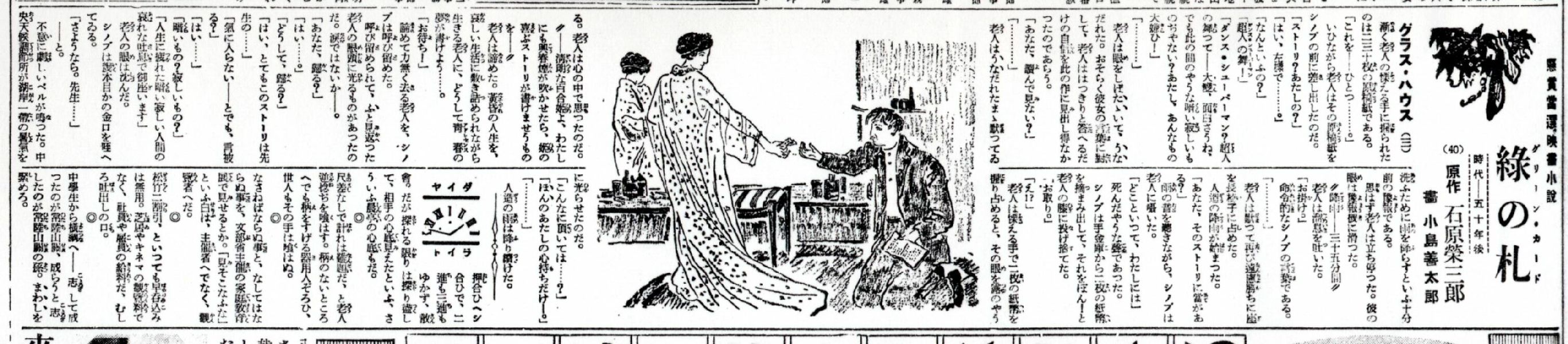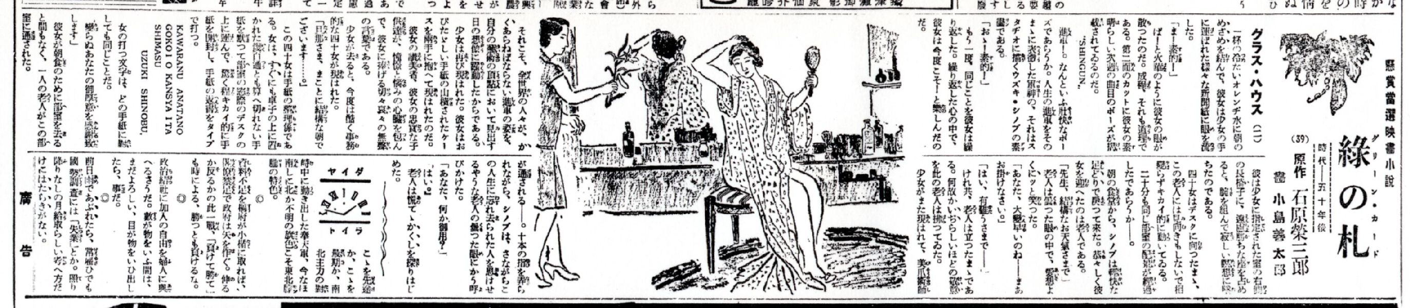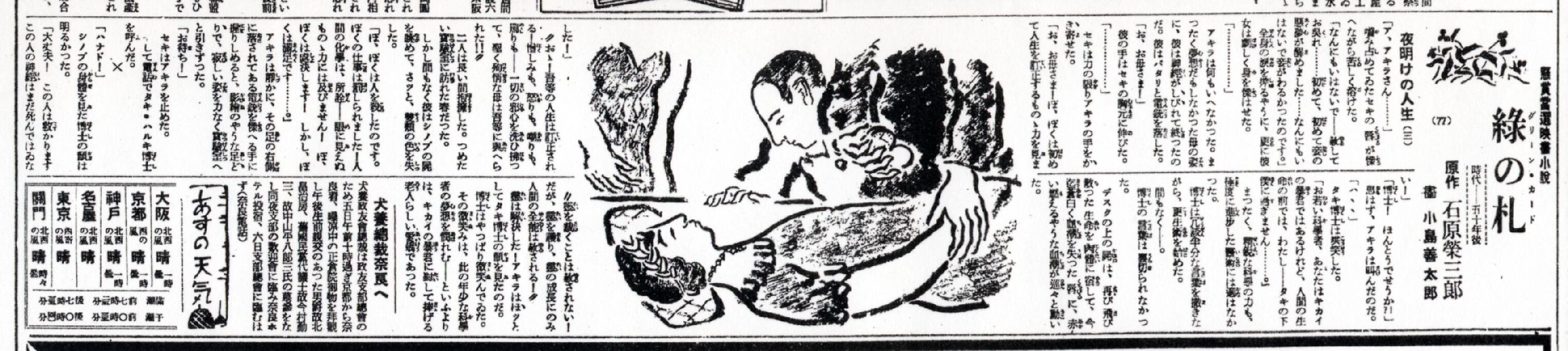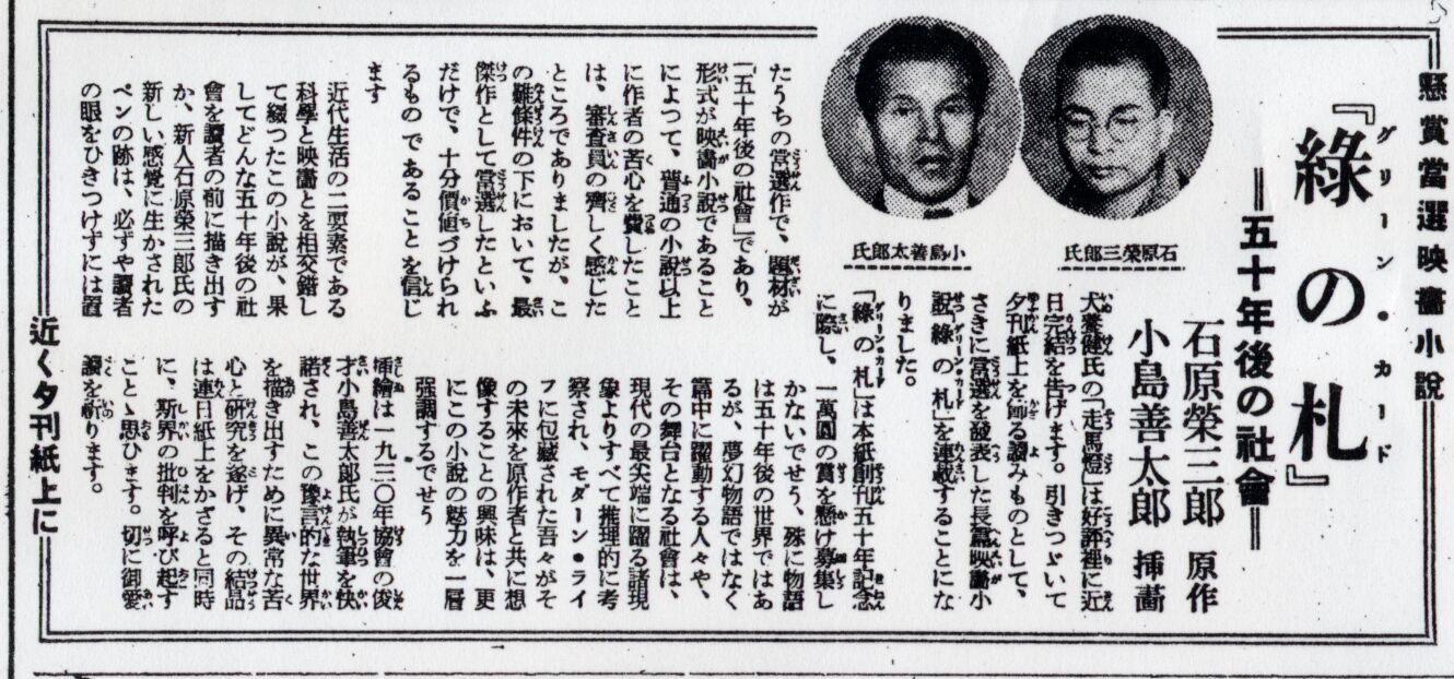 大阪朝日新聞夕刊に昭和五年七月二十日から十一月八日まで七十九回に亘り連載された懸賞当選映画小説「緑の札(グリーン・カード)」で御座居ます。作者の石原栄三郎氏の消息が掴めない為、著作権の問題が有る可能性が御座居ますが、敢えて公開させて頂きます。著作権者の申し入れが御座居ましたら直ちに閉鎖する用意が有ります。