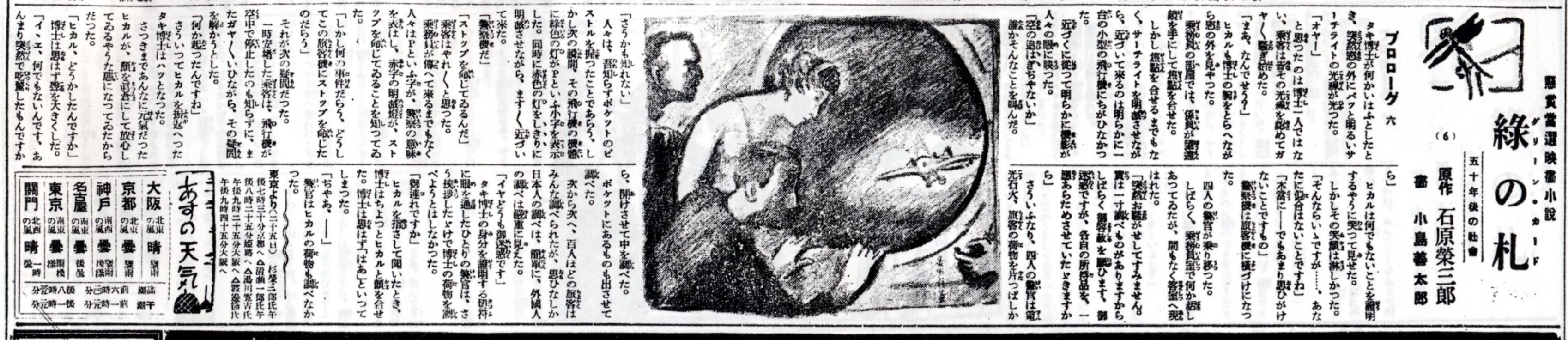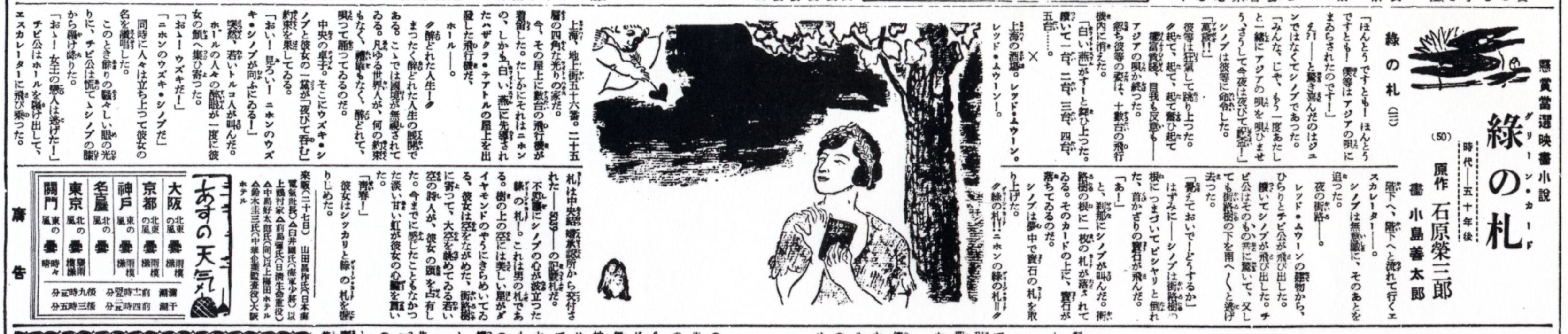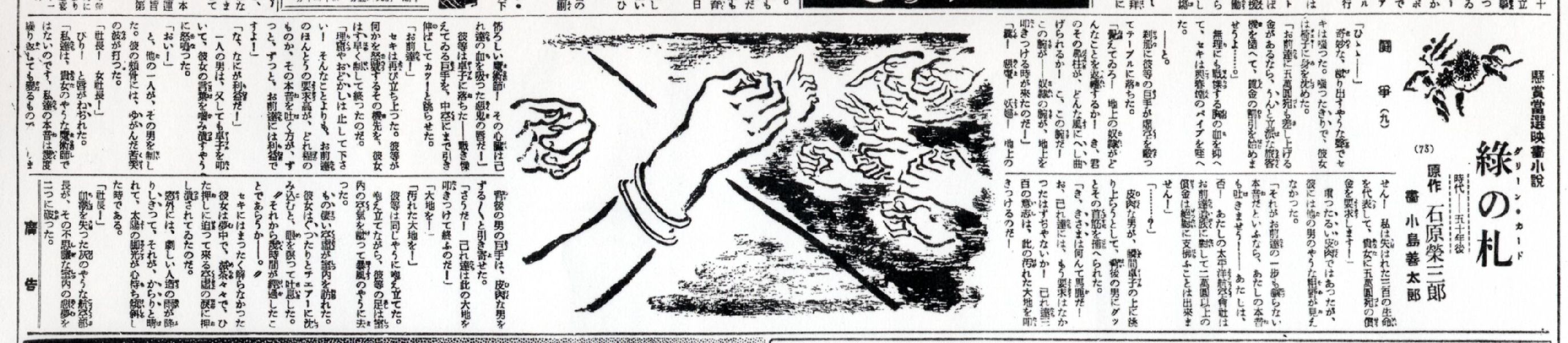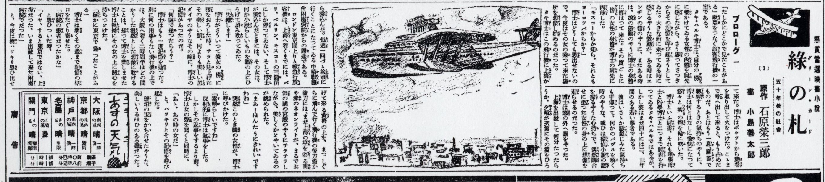 大阪朝日新聞夕刊に昭和五年七月二十日から十一月八日まで七十九回に亘り連載された懸賞当選映画小説「緑の札(グリーン・カード)」で御座居ます。作者の石原栄三郎氏の消息が掴めない為、著作権の問題が有る可能性が御座居ますが、敢えて公開させて頂きます。著作権者の申し入れが御座居ましたら直ちに閉鎖する用意が有ります。