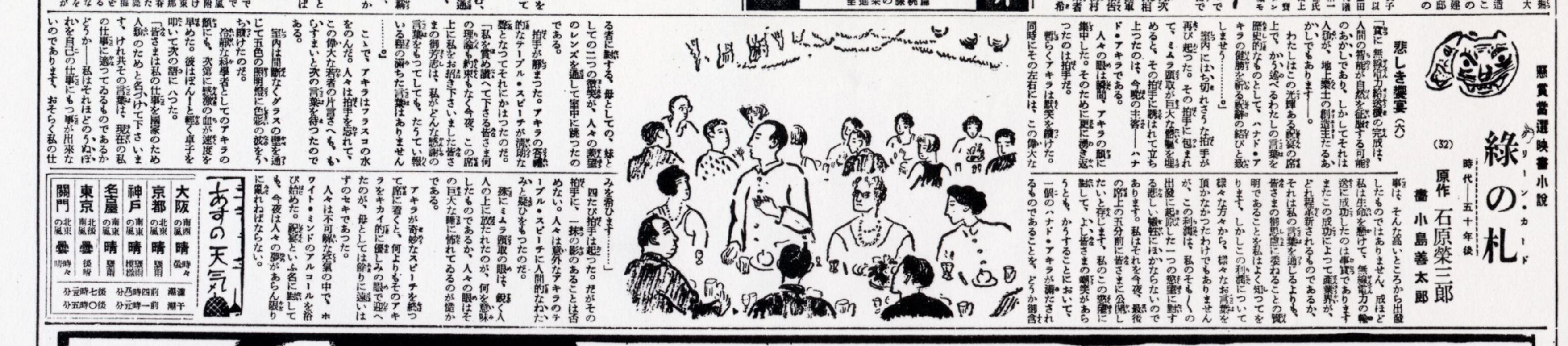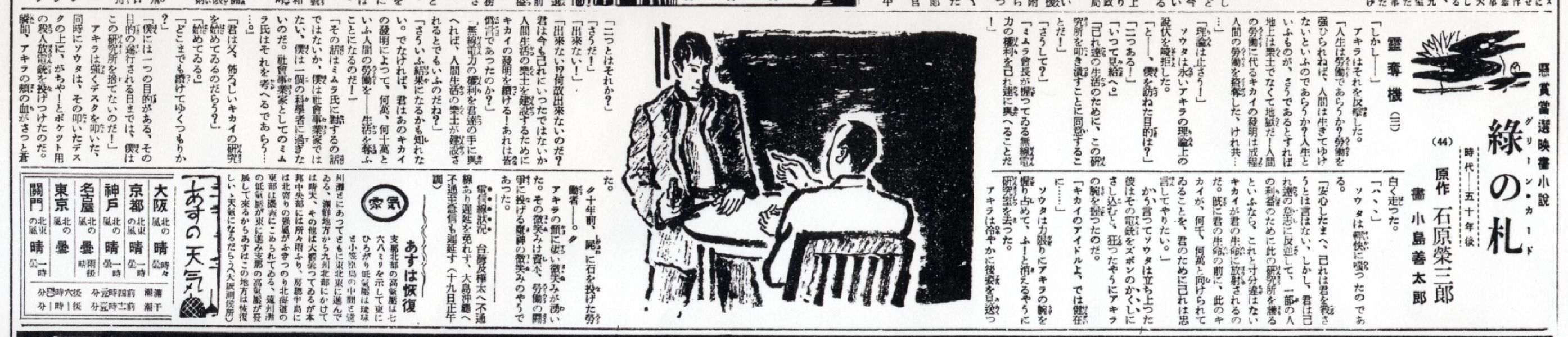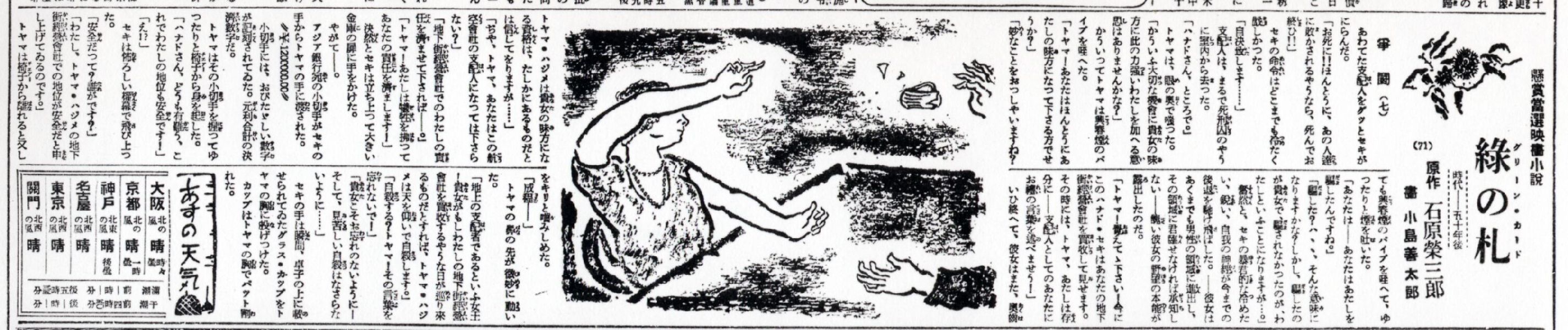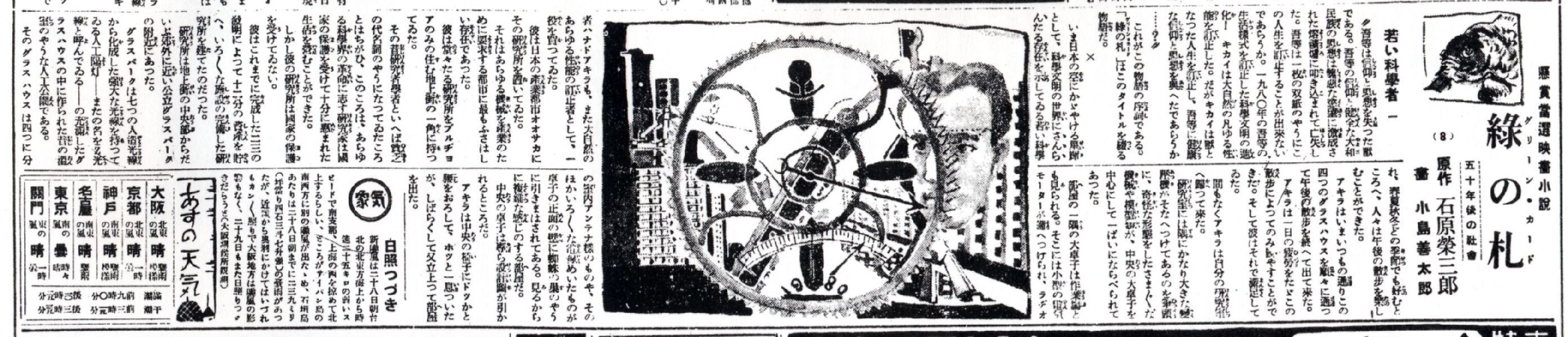 大阪朝日新聞夕刊に昭和五年七月二十日から十一月八日まで七十九回に亘り連載された懸賞当選映画小説「緑の札(グリーン・カード)」で御座居ます。作者の石原栄三郎氏の消息が掴めない為、著作権の問題が有る可能性が御座居ますが、敢えて公開させて頂きます。著作権者の申し入れが御座居ましたら直ちに閉鎖する用意が有ります。