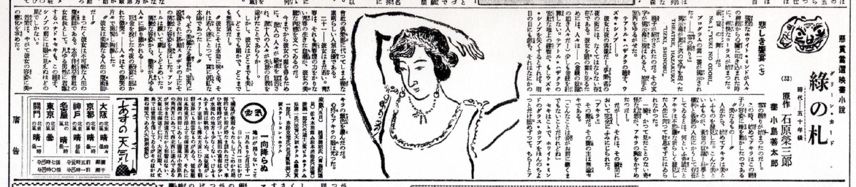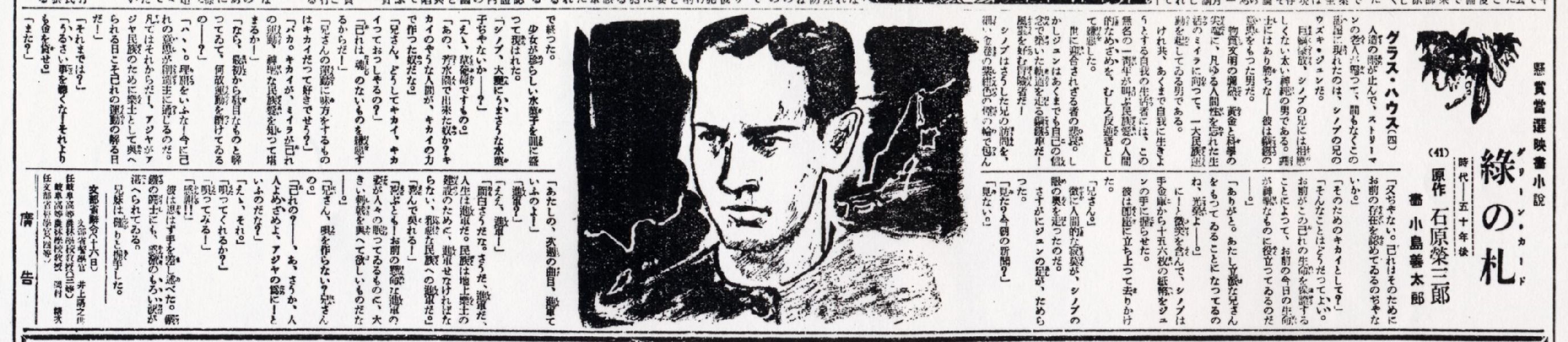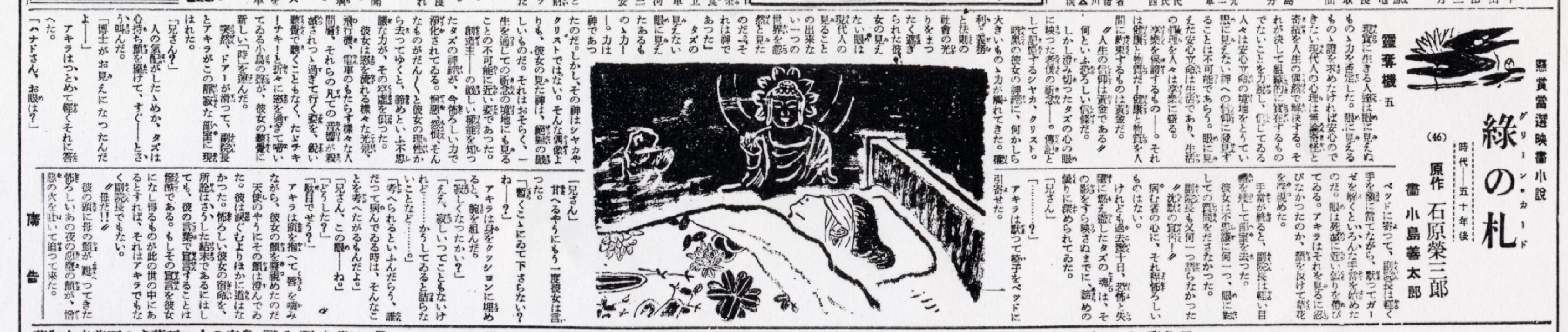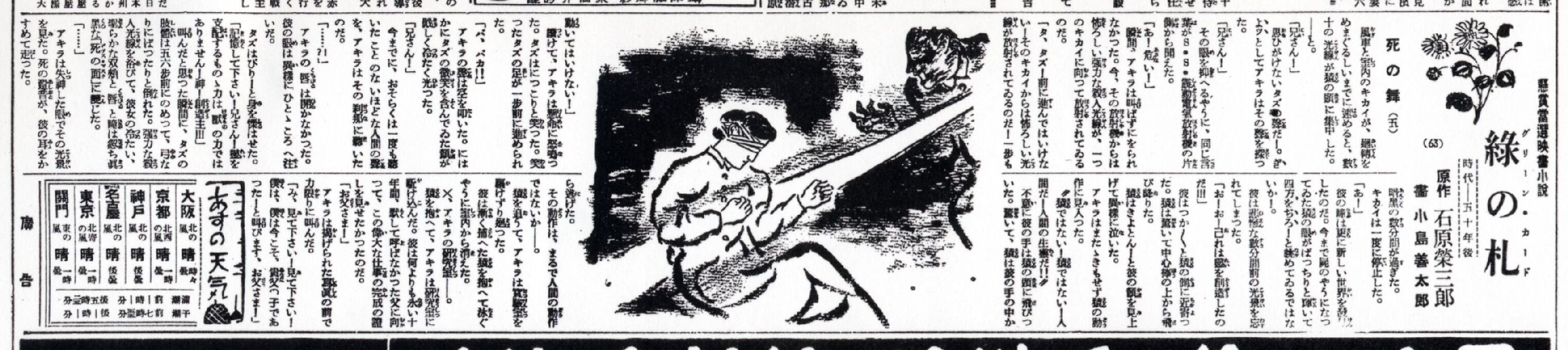 大阪朝日新聞夕刊に昭和五年七月二十日から十一月八日まで七十九回に亘り連載された懸賞当選映画小説「緑の札(グリーン・カード)」で御座居ます。作者の石原栄三郎氏の消息が掴めない為、著作権の問題が有る可能性が御座居ますが、敢えて公開させて頂きます。著作権者の申し入れが御座居ましたら直ちに閉鎖する用意が有ります。