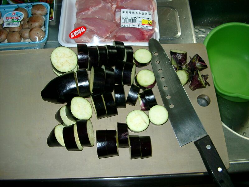 - 茄子は蔕を切断廃棄後、二糎厚の輪切。水に晒して灰汁抜き。