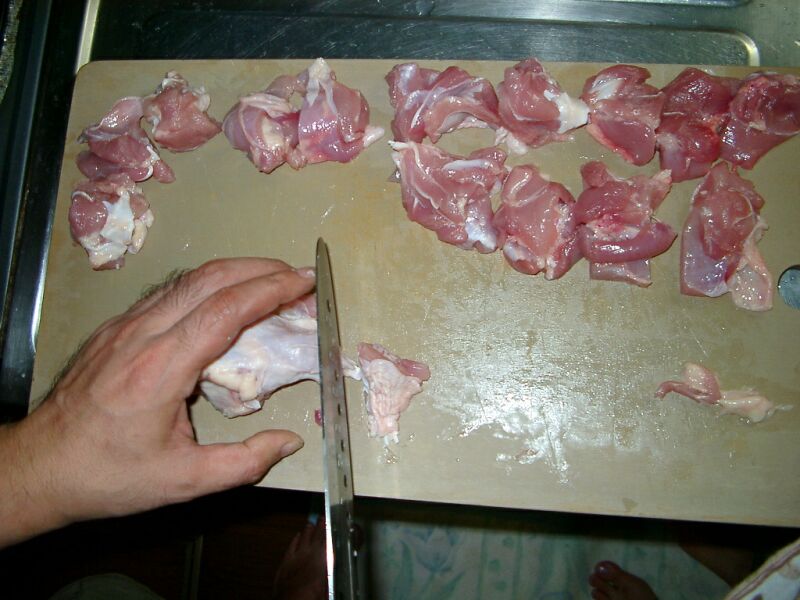 鶏腿肉を一口大に切断。脂は除去廃棄。
