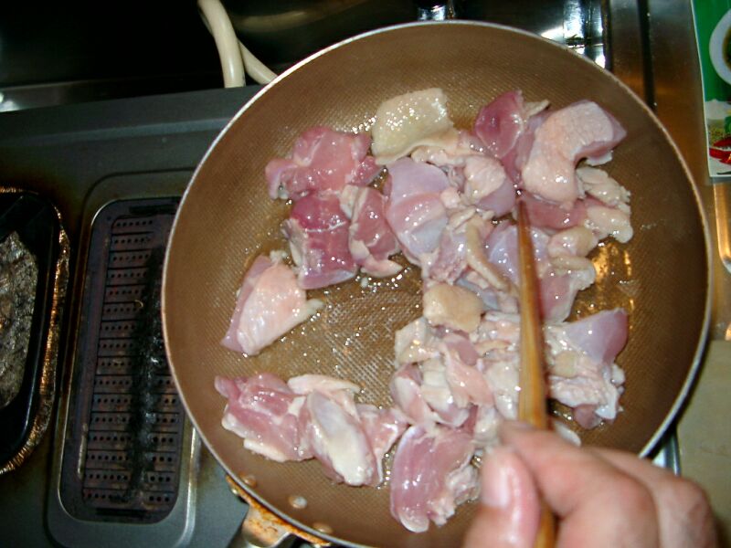 鶏腿肉を投入、軽く塩胡椒、白濁する迄炒める。