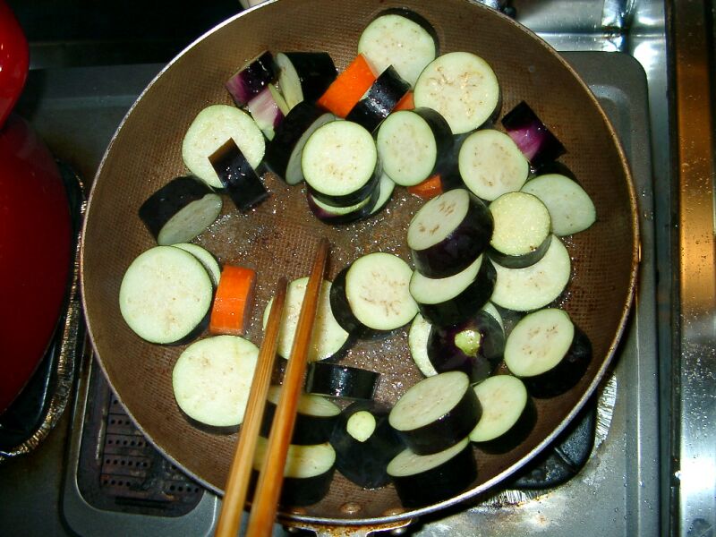 - 茄子を投入。灰汁は除去。茄子に火が通ったら・・・