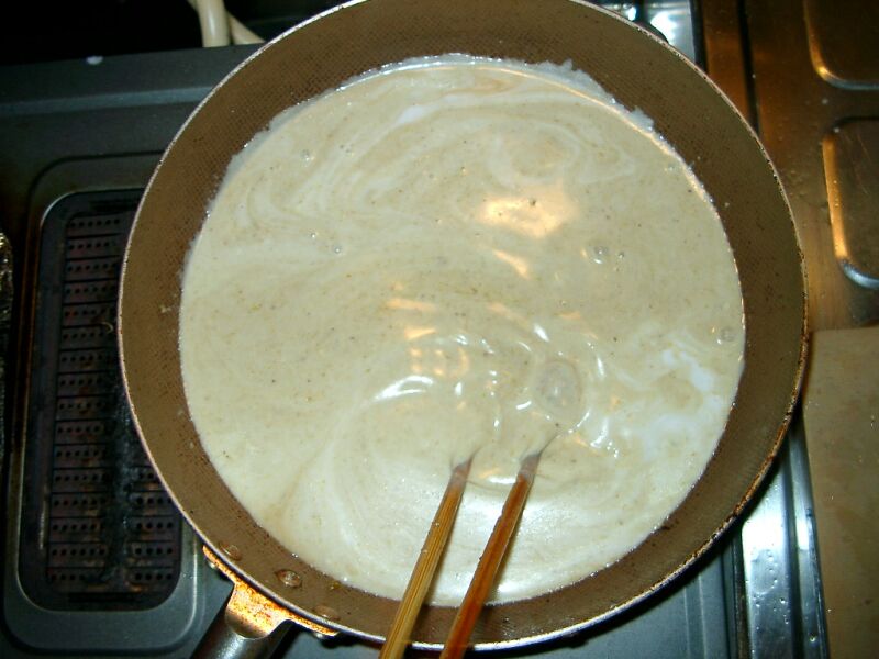- 椰子実乳固形分投入。更に炒める。油が浮いてきたら・・・