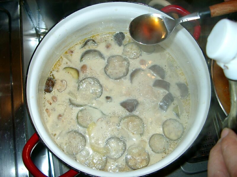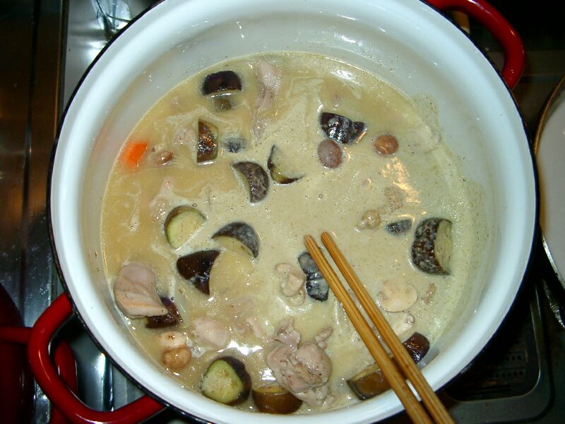 椰子実乳と水を投入。沸騰後弱火で十分煮込む。灰汁は適宜除去廃棄の事。
